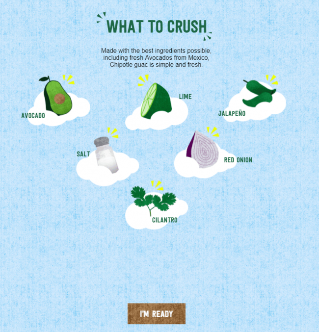 Chipotle a développé une large gamme de jeux mobiles et basés sur le Web. Tous finissent généralement par fournir un coupon si vous gagnez. Celui-ci, par exemple, vous demande de créer la recette de guac parfaite avec tous les bons ingrédients.